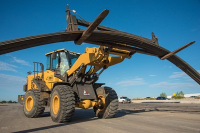 The loaders are fitted with 12-ft. forks to move 40-ft. bundles of rebar, with many of the loads weighing up to 6 tons.